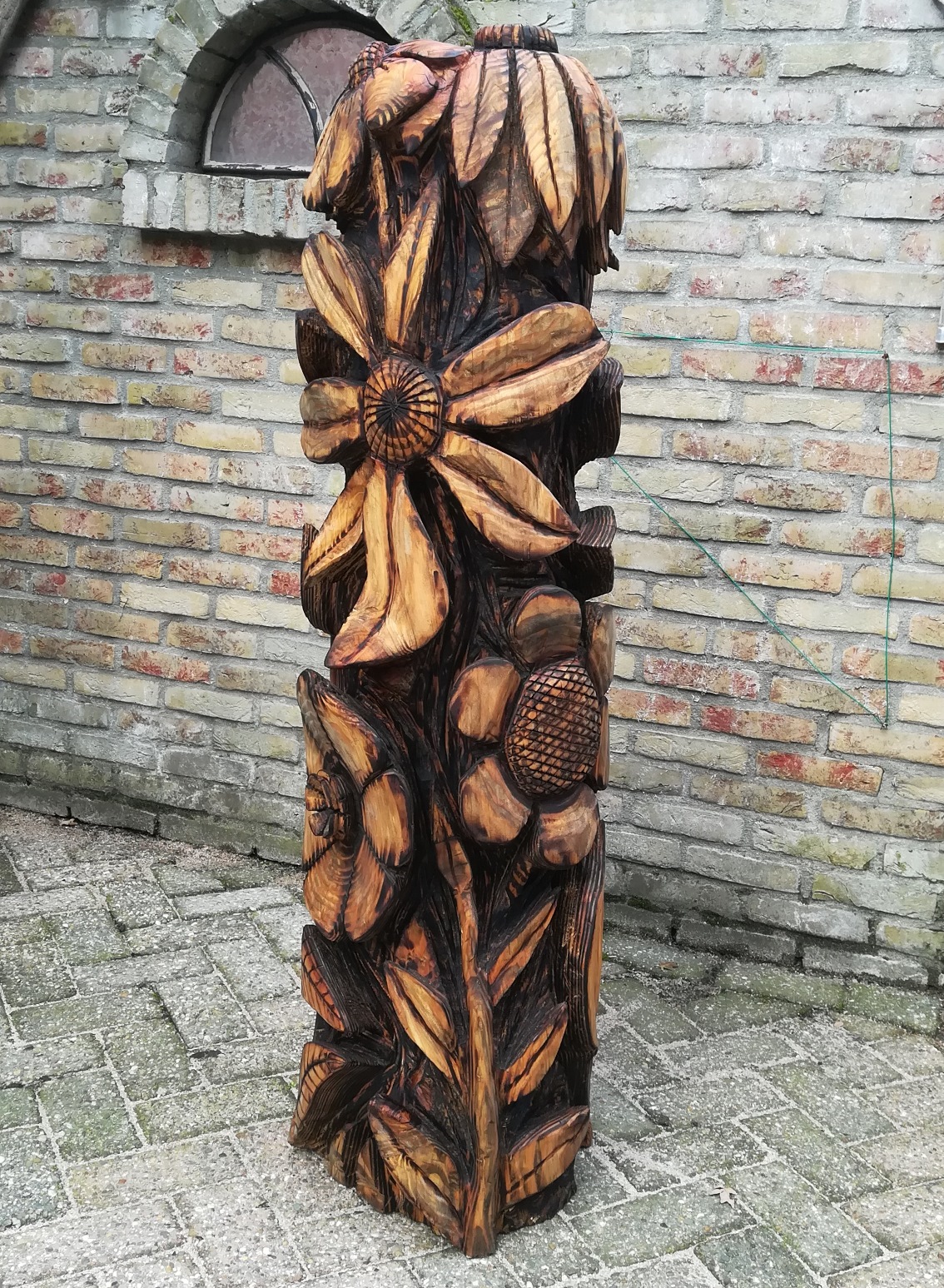 Uit een flinke douglas-houten boomstam heb ik dit bloemstuk gezaagd. Het grootste kunstwerk tot nu toe.