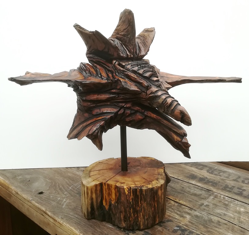 Een drakenkop gemaakt uit een grillig stuk hout dat al ongeveer deze vorm had. Met de kettingzaag heb ik hem verder vorm gegeven