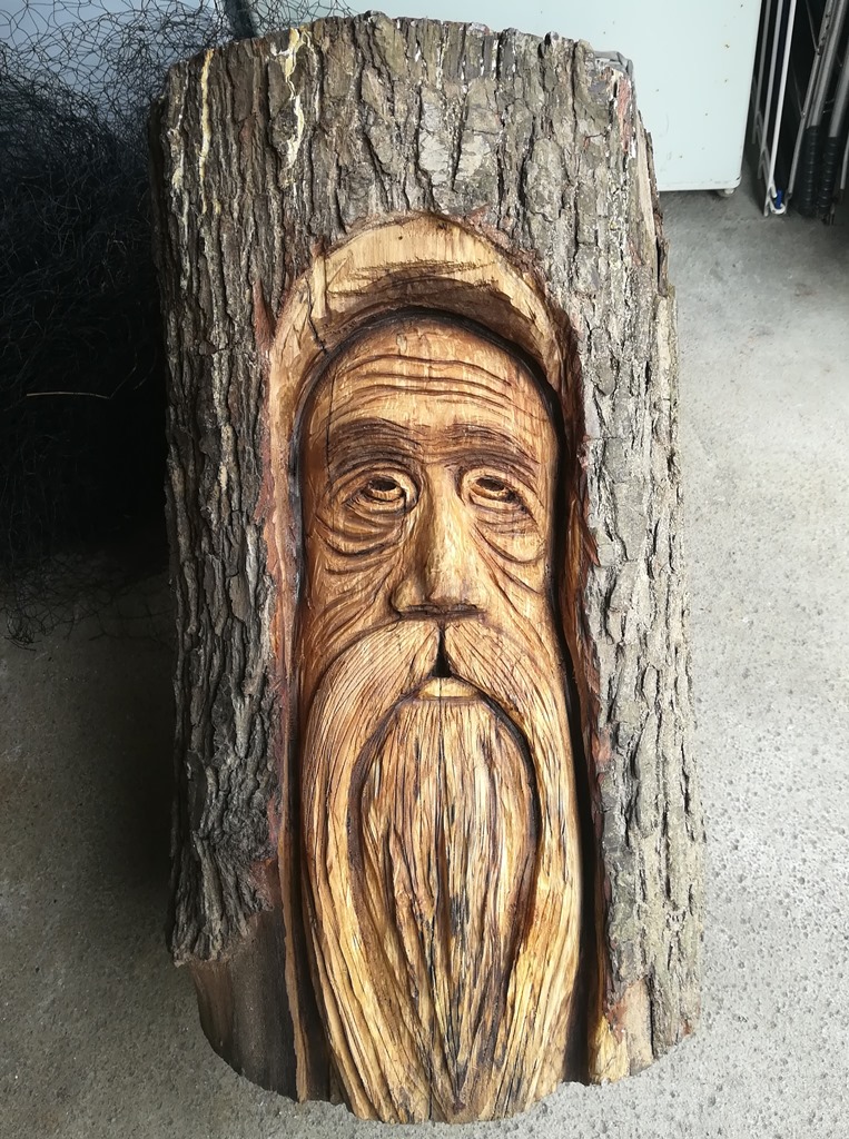 Een Gallische druïde. Met een kettingzaag uit deze eiken stam gezaagd.