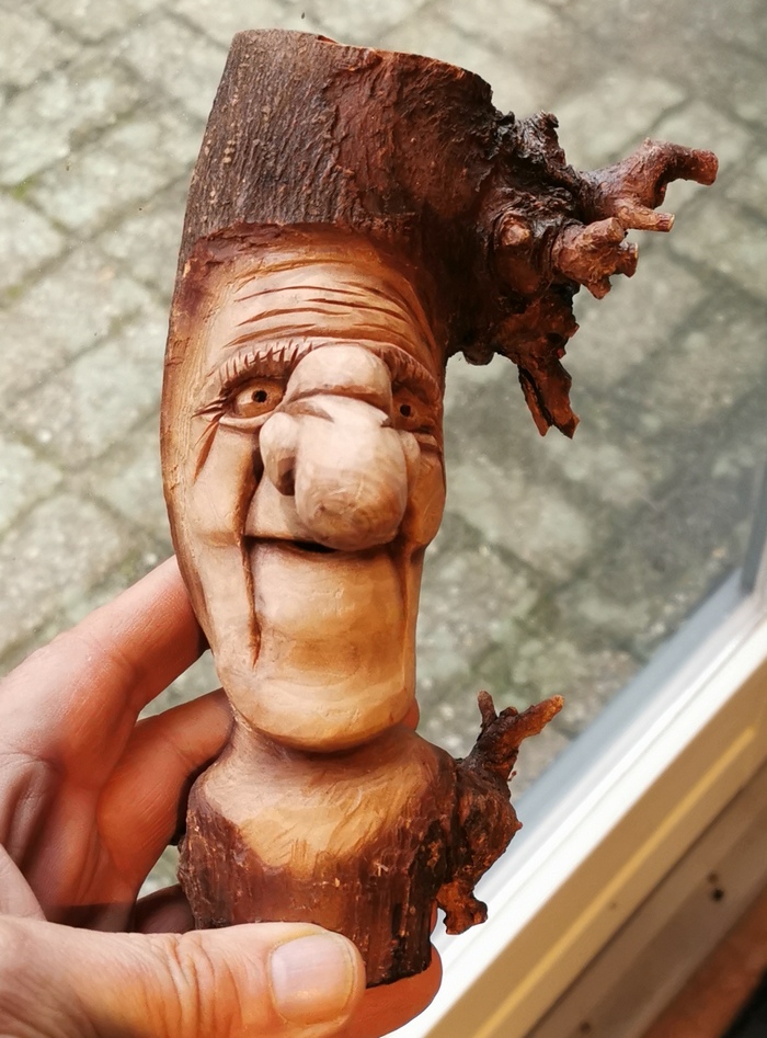 Handmatig heb ik met een z.g. woodcarving mesje deze vrolijke jongen gesneden uit een ruwe tak van een perenboom.