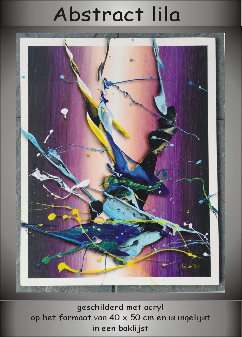 Het lila vormt een rustige ondergrond waarover lijnen en verfspatten zich