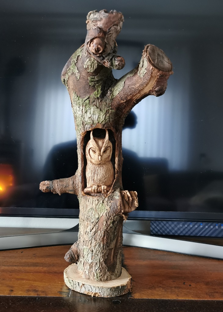 Handmatig heb ik met z.g. woodcarving mesjes dit uiltje gesneden uit een ruwe tak. Hij is in totaal 37 cm hoog.