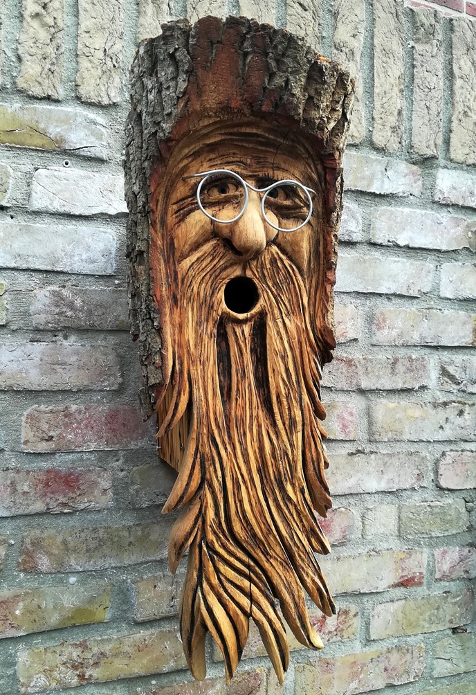 Een vogelhuis uit een eiken stam gezaagd, met kettingzaag en slijptol.